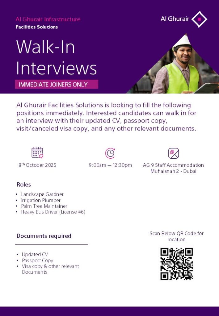 Al Ghurair Facilities Solutions is looking to hire for the below positions on an urgent basis. Candidates with cancelled visas or transferable visas will be given preference.