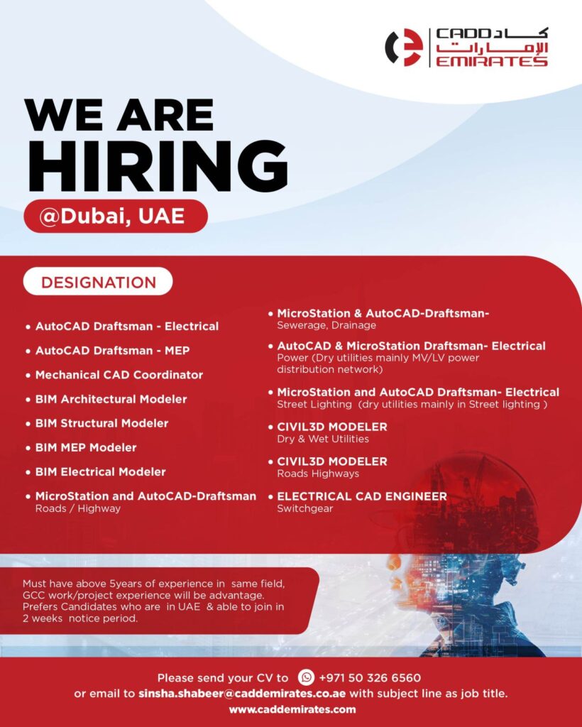 hashtag#CADDemirates hashtag#HiringNow hashtag#DubaiJobs hashtag#UAEJobs hashtag#AutoCADJobs hashtag#BIMJobs hashtag#MicroStationJobs hashtag#DraftsmanJobs hashtag#EngineeringCareers hashtag#ConstructionJobs hashtag#MiddleEastJobs hashtag#CivilEngineeringJobs hashtag#ArchitectureJobs hashtag#JoinOurTeam hashtag#BIMCareers hashtag#Dubai hashtag#UAE