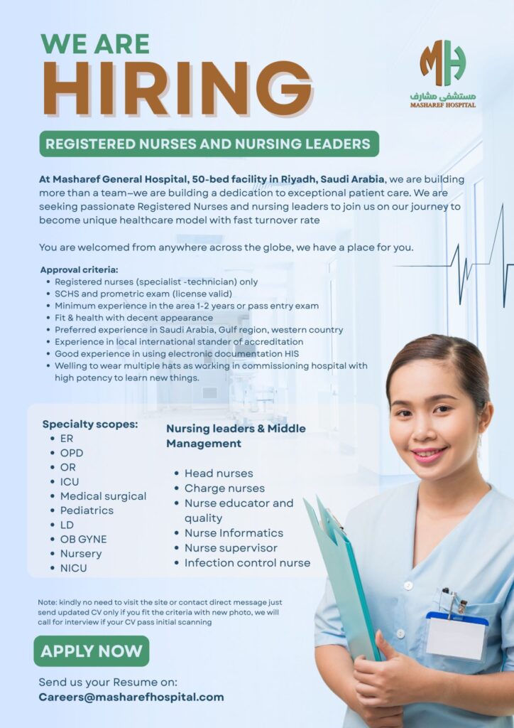 The Masharef General Hospital in Riyadh is actively recruiting registered nurses and nursing leaders. The recruitment for various specialties, including ER, OR, ICU, Medical Surgical, Pediatrics, and OB/GYNE, is currently ongoing.