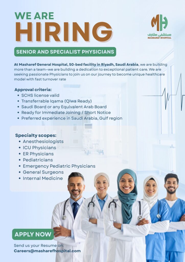 Masharef General Hospital is actively hiring senior and specialist physicians for its 50-bed facility in Riyadh, Saudi Arabia. The hospital is preparing for operations and is looking to build its medical team.