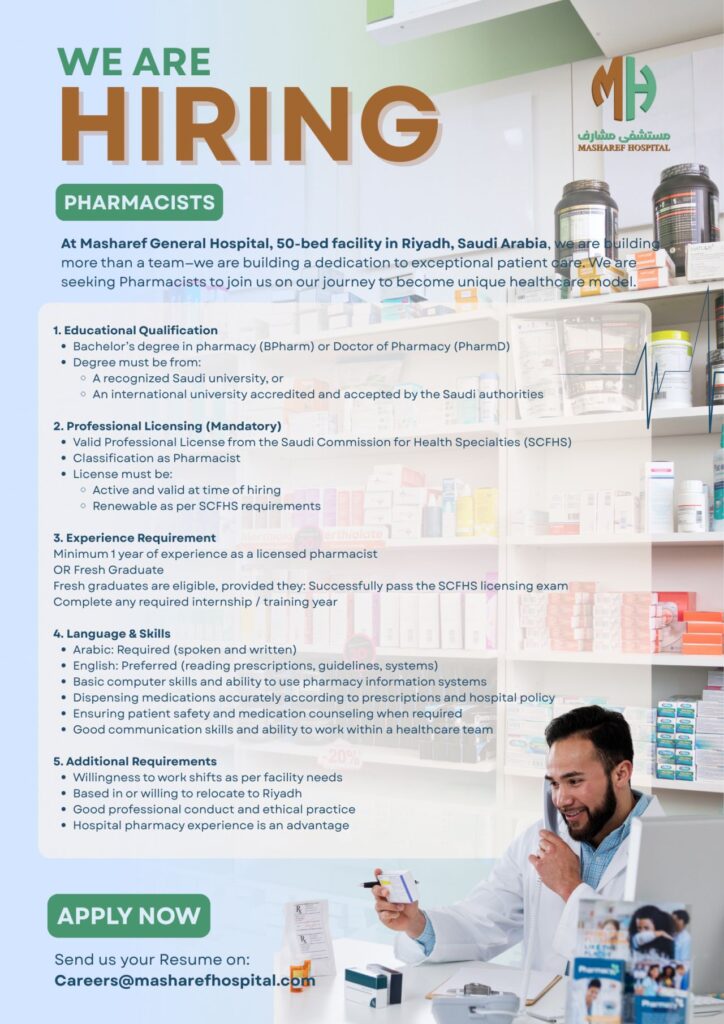 Masharef General Hospital is actively recruiting pharmacists for its new 50-bed facility in Riyadh, Saudi Arabia. The image provided is a LinkedIn job posting detailing the specific requirements and how to apply.